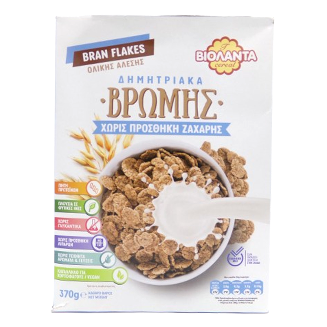 Violanta produces several types of no sugar added cereals in a 370g size, including Oat & Bran Flakes, Corn Cereal, and Zero Cereals with Cocoa. These products are available for purchase from various online supermarkets, predominantly those operating in Greece and Cyprus