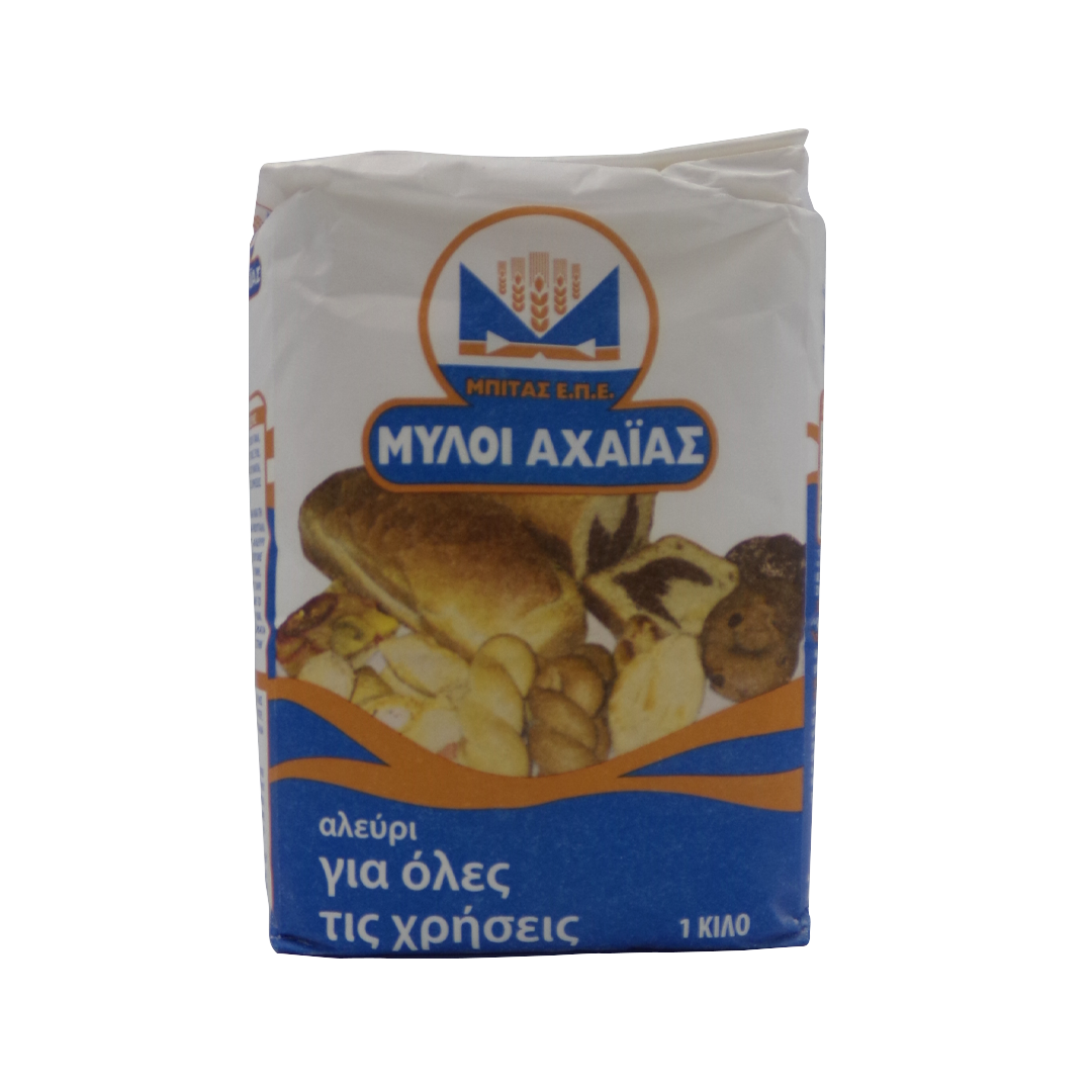 ACHAIAS MILLS FLOUR G.O.X 1KG”refers to soft wheat flour(not wholemeal) from the company “Achaia Mills”, packaged in a 1 kilo bag, suitable for various uses such as bread, pies, cakes, cookies and donut