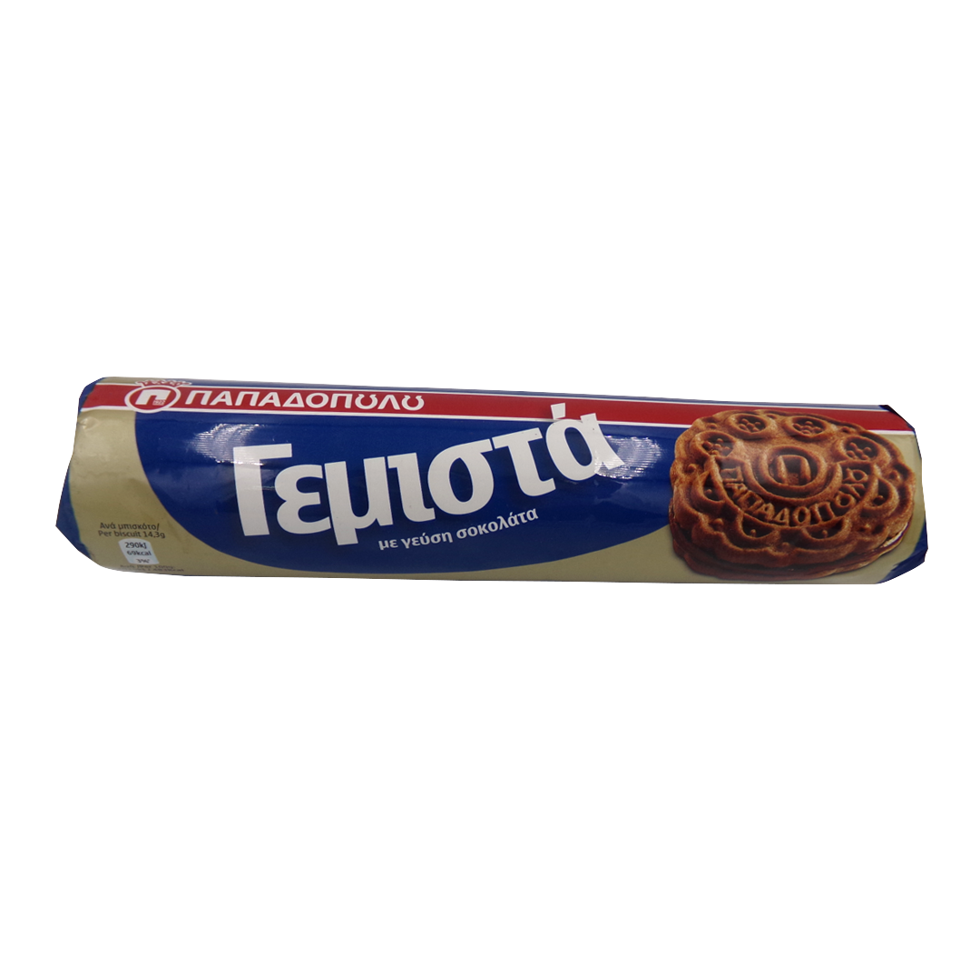 PAPADOPOULOS FILLED CHOCOLATE”are chocolate-flavored sandwich cookies, filled with a chocolate-flavored cream, and area chocolate version of the classic Gemista series, offering a rich chocolate experience. Specifically, ChocoGemista, part of the same series, has a milk chocolate coating.