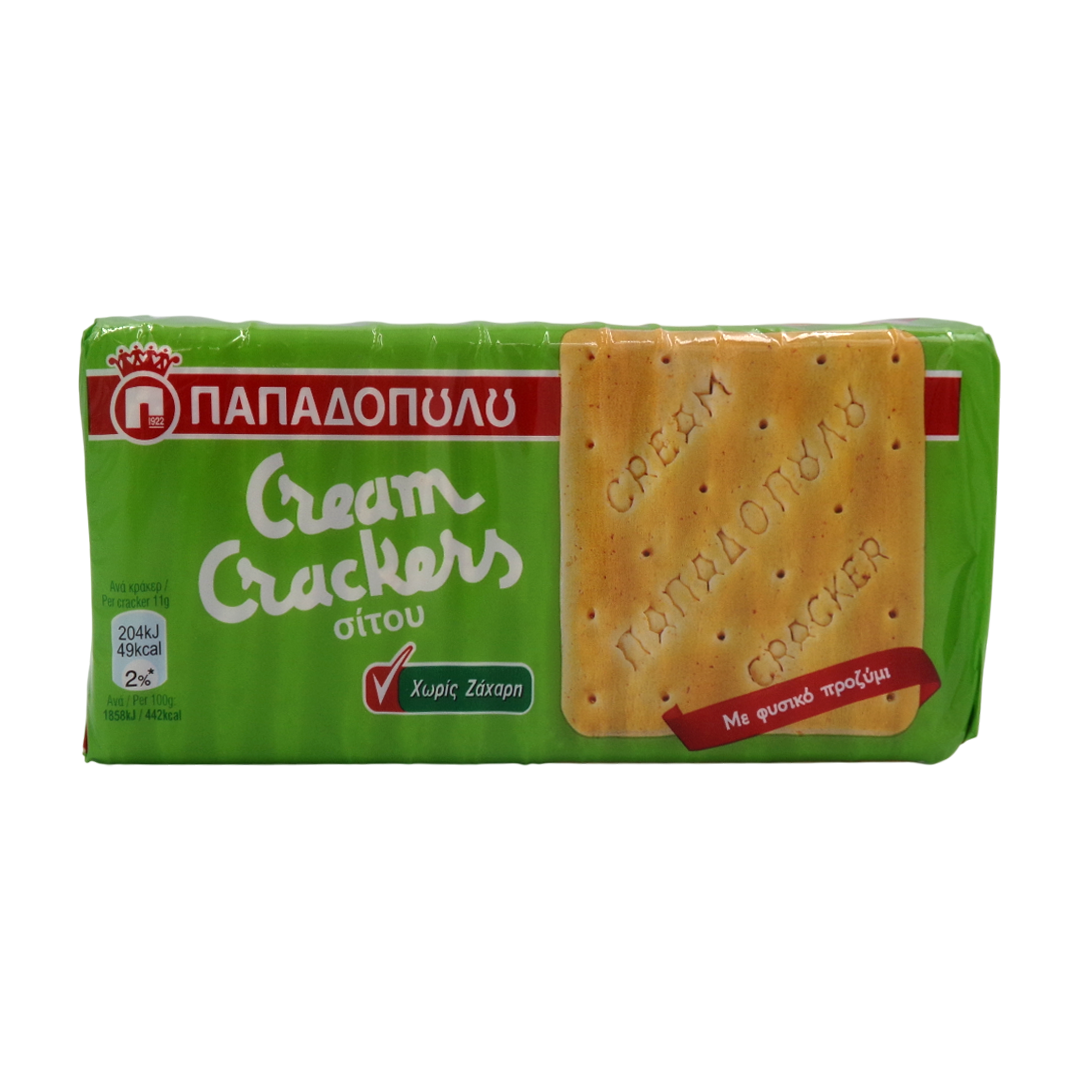 Papadopoulou Cream Crackers Sugar-Free are light, crunchy crackers made with a traditional sponge dough, natural sourdough, and a slow, hand-folded process for a rich, satisfying flavor without added sugar. T
