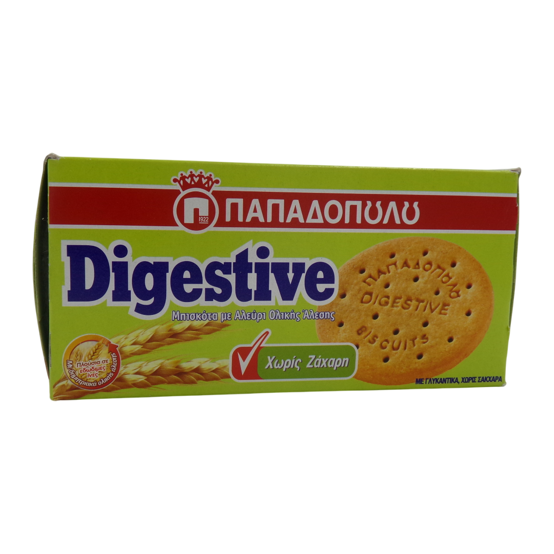 Papadopoulos Sugar-Free Digestive biscuits (250g) are sugar-free, whole-grain biscuits made with wholegrain wheat flour, providing a good source of fiber for a natural, wholesome taste experience.