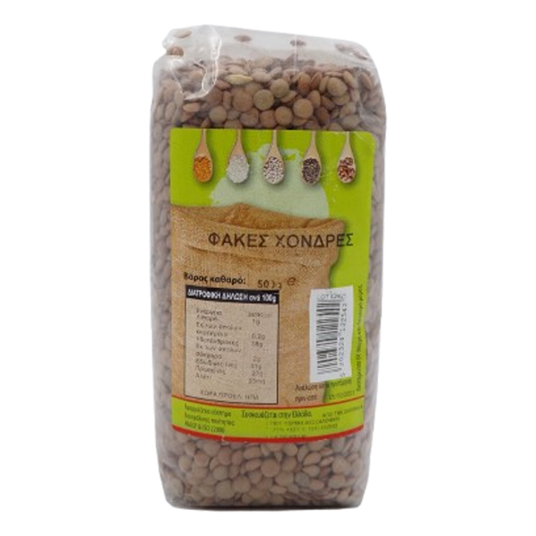 ΦΑΚΕΣ ΧΟΝΔΡΕΣ 500GR describes a 500-gram package of thick, or large, brown lentils. These lentils are a staple in Greek cuisine and are known for their hearty, earthy flavor and nutritional value.