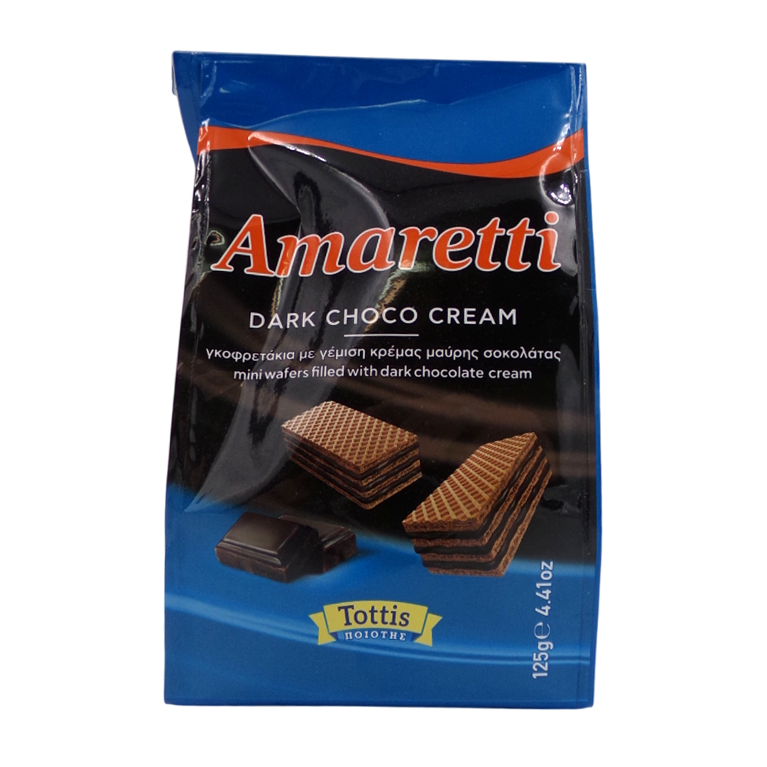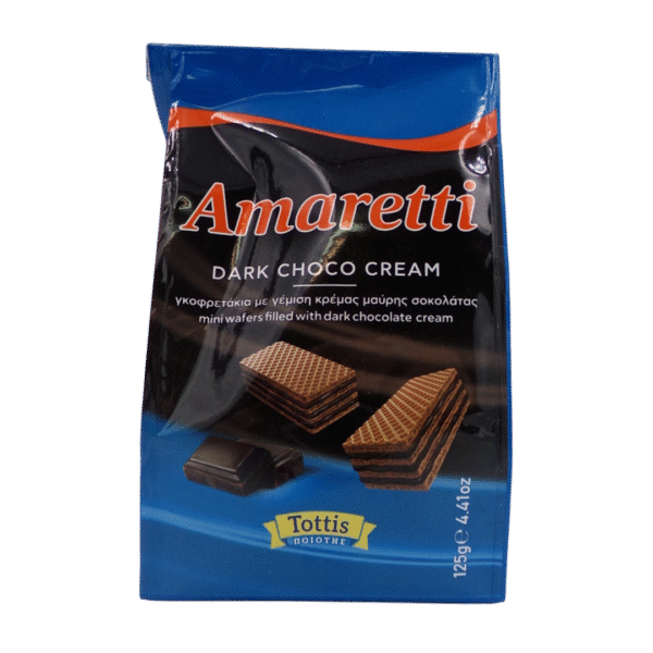 The AMARETTI CHOCO LOVE ΓΚΟΦΡΕΤΑΚΙΑ 125G are mini wafer rolls from Tottis Amaretti, filled with a chocolate cream and coated with a delicate amaretti flavor. The product is a light and crispy snack, combining the sweet taste of amaretti with a rich chocolate filling, Ingredients: