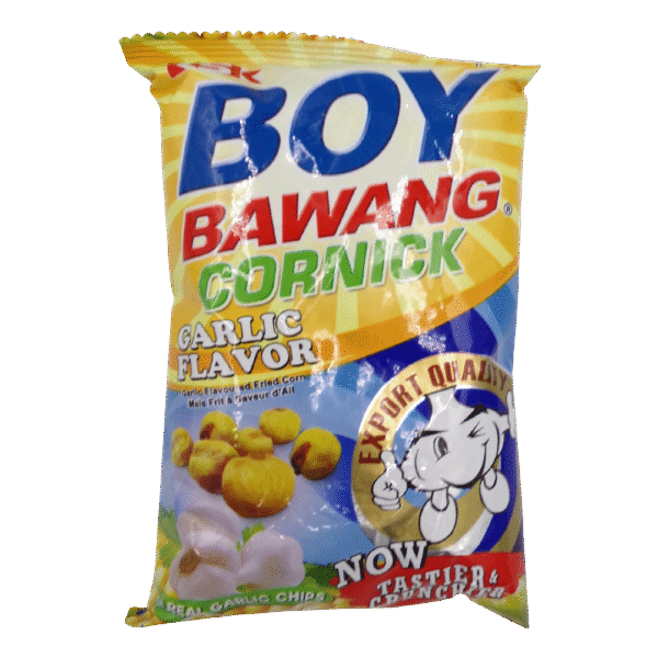 Fried corn, Vegetable oil (coconut oil and/or palm oil / palm olein), Garlic crisps, Salt, Garlic powder, Monosodium glutamate, Sugar, Chili powder.