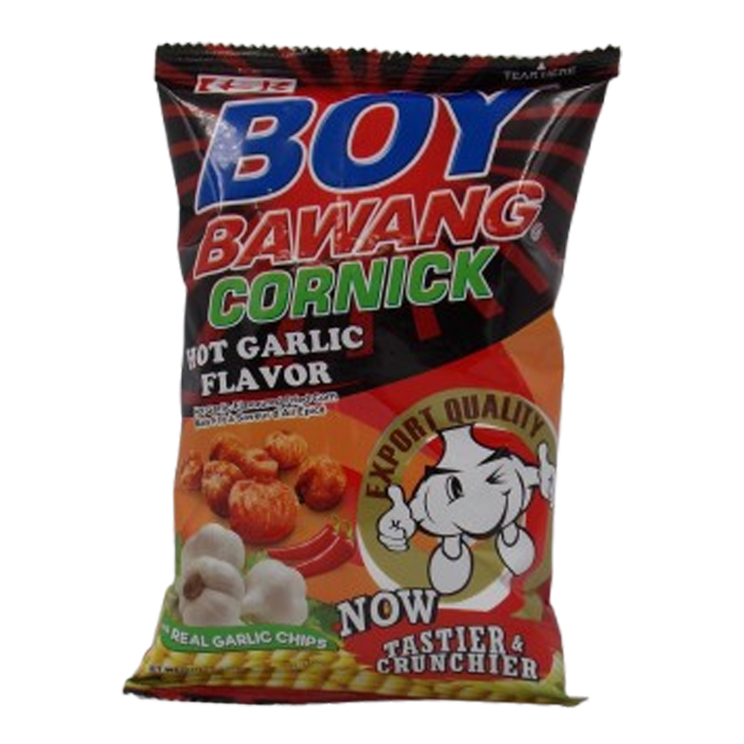 “Boy Bawang Hot Garlic is a Filipino fried corn snack (cornick) made from roasted corn kernels seasoned with a bold, spicy blend of garlic and chili powder. It delivers a potent, savory, and spicy flavor profile with an ultra-crispy texture, offering an intense, crunchy bite perfect for snacking, especially for those who enjoy heat and garlic. This iconic snack is a favorite in the Philippines and is enjoyed on its own or as a savory addition to meals and other snacks. Ingredients