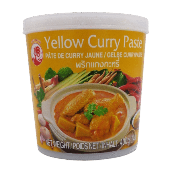 Create authentic Thai flavors at home with Cock Brand Yellow Curry Paste, a mildly spicy and aromatic blend rooted in traditional Thai cuisine. Made with a mix of turmeric, garlic, lemongrass, galangal, and spices, this paste delivers the signature golden color and warm, slightly sweet taste of classic yellow curry. Ingredients: dried red chili (20%), shallots, garlic, lemongrass, salt, galangal, turmeric, cumin, coriander seeds, spices (cinnamon, mace).