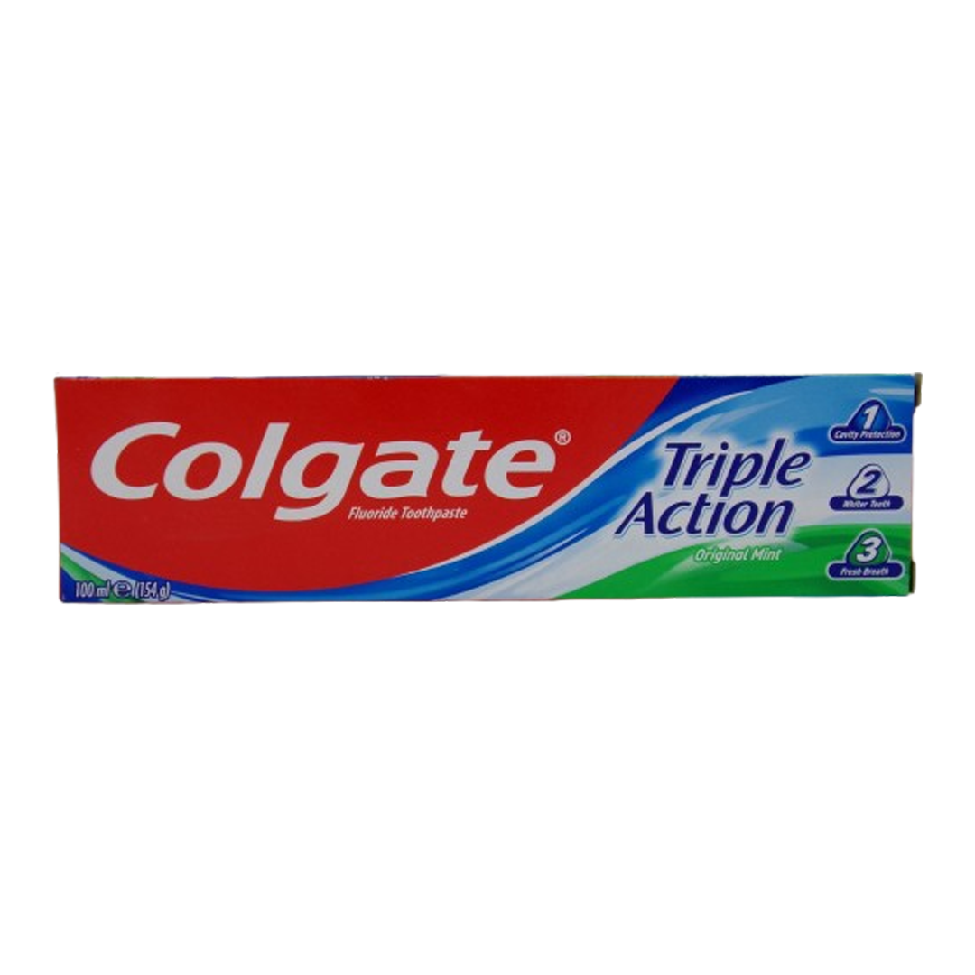 Colgate Triple Action Fluoride Toothpaste Original Mint 100ml (Pack of 3) Product Description Contains fluorine to protect against cavities, triple Action. Whitens teeth. Helps remove surface stains for whiter teeth Freshens breath. Great mint taste for fresh breath 100ml of Colgate Triple Action toothpaste with a great mint taste The triple-clean feeling of Colgate Triple Action Toothpaste will keep you smiling all day. It contains fluoride to help protect against cavities, helps remove surface stains for whiter teeth, and has a great mint taste for fresher breath. The triple-clean feeling of Colgate Triple Action Toothpaste will keep you smiling all day. It contains fluoride to help protect against cavities, helps remove surface stains for whiter teeth, and has a great mint taste for fresher breath. Contains fluoride Helps protect against cavities Helps remove surface stains Pack size: 100ML x 3 Ingredients Calcium Carbonate, Aqua, Sorbitol, Sodium Lauryl Sulfate, Hydrated Silica, Sodium Monofluorophosphate, Aroma, Cellulose Gum, Sodium Carbonate, Xanthan Gum, Benzyl Alcohol, Sodium Saccharin, Sodium Bicarbonate, Eugenol, CI 74160, CI 74260