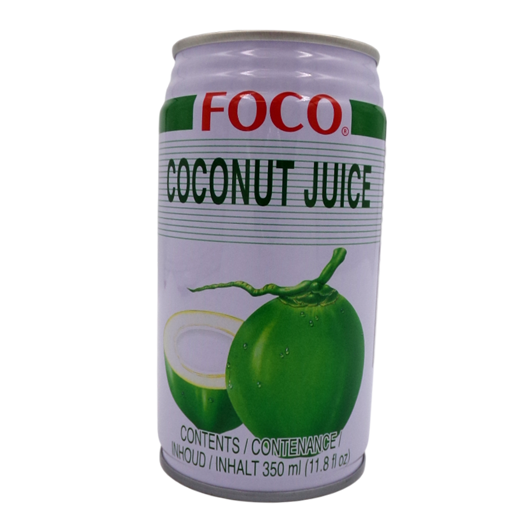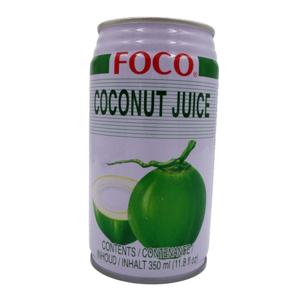 Foco Coconut Juice 350ml is a canned beverage that features the sweet and tropical taste of coconut water, often with small pieces of coconut pulp, and is a hydrating drink made from high-quality young coconuts. The product is popular for its natural, sweet flavor, and is a good source of electrolytes, making it a refreshing and healthy alternative to other sugary drinks, especially when chilled. Junger Kokosnusssaft 80 % . Wasser , Zucker , junge Kokosnussfruchtfleischstückchen 5 %