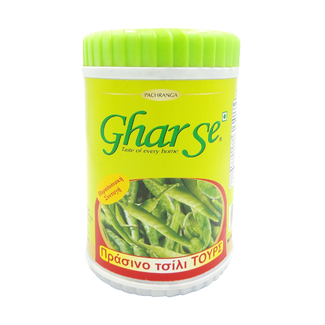 GHAR SE Green Chilli Pickle is a spicy, tangy, traditional South Asian condiment made from fresh green chilies marinated in a blend of spices, salt, and oil. This 800 g jar is a family-size serving ideal for everyday meals and loved by those who enjoy bold, fiery flavours.