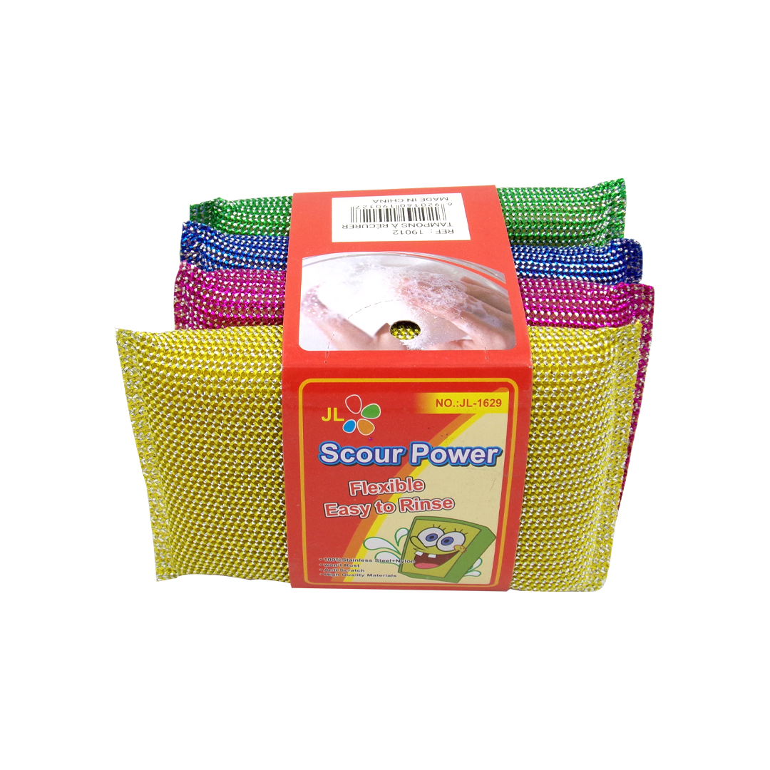 A pack of four strong scouring pads designed for effective cleaning of pots, pans, and kitchen surfaces. Durable and powerful against tough grease and dirt, while suitable for everyday household cleaning tasks. Ideal for kitchens and general cleaning use.