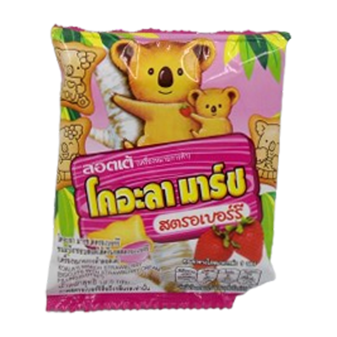 Koala’s March Strawberry Biscuit 19.5″ refers to a single-serving pack of Lotte’s popular strawberry-flavored koala-shaped cookies, a sweet, crispy biscuit with a creamy strawberry filling that is sold internationally. The “19.5” likely indicates a 19.5g serving size of the product. Ingredients: strawberry cream (milk, palm oil, rapeseed oil, sugar), milk powder, lecithin, wheat flour, corn starch, sugar, thickener: E170i, raising agent: E503, E500, sugar, salt, dye E150d, E129, aroma : milk, vanilla. Allergens: milk, soy, wheat. Nutritional values per 100g: Energy 516 kcal / Fat 26.6g of which saturated 22.4g / Carbohydrates 66g of which sugar 44g / Protein 3.67g / Salt 225g