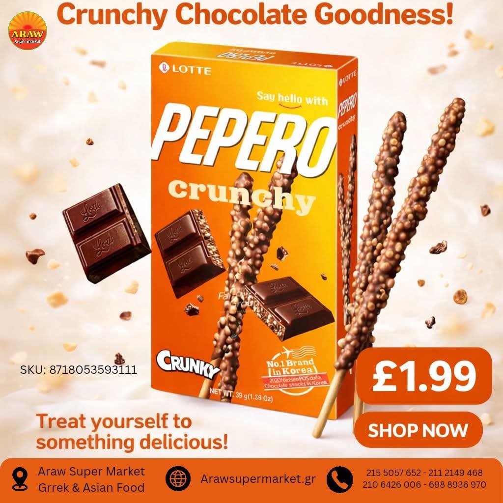 Lotte Pepero Crunchy 32G are thin, crispy biscuit sticks coated in rich, creamy milk chocolate and sprinkled with crunchy cookie bits or crushed almonds for added flavor and texture. This snack offers a delightful contrast of creamy chocolate and an invigorating crunch, making it a popular Korean treat. It is certified Halal and Vegetarian.