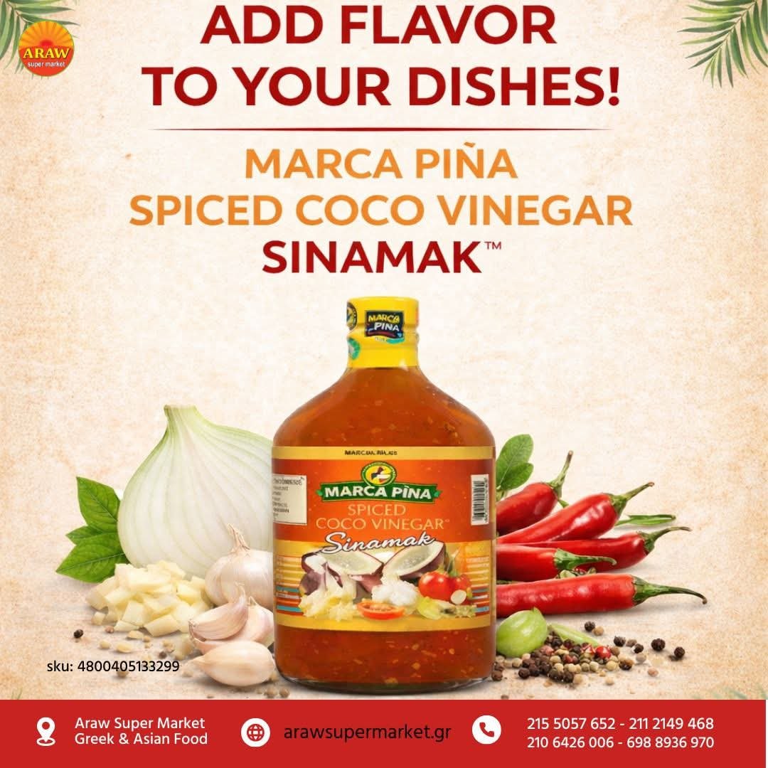 Marca Piña Spiced Coco Vinegar is a flavorful and aromatic vinegar crafted from fermented coconut sap, infused with a blend of spices such as chilies, garlic, onions, ginger, and bay leaves. It offers a balanced tangy taste with hints of spice, commonly used in Filipino and Southeast Asian cooking as a dipping sauce, in marinades, and to enhance dishes like adobo.