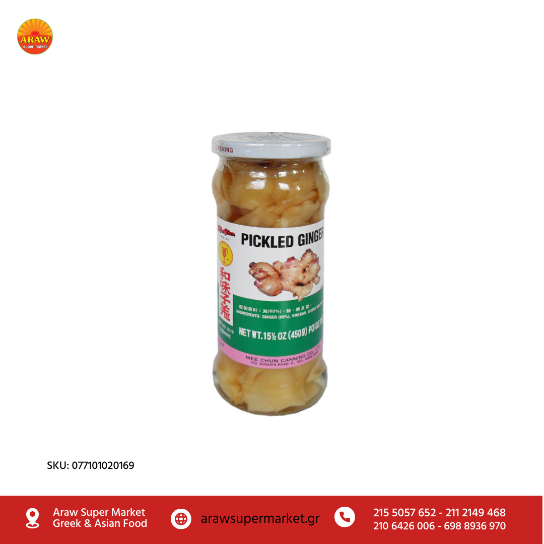 Thin slices of ginger, typically made from young ginger, pickled in a solution of vinegar, sugar, and salt, giving it a tangy and slightly sweet taste. It is commonly served alongside sushi or sashimi to cleanse the palate between bites.