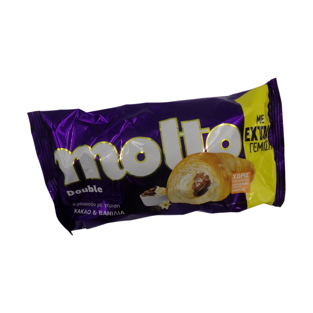 “MOLTO CROISSANT WITH COCOA 98GR is a double-filled croissant with cocoa cream and vanilla cream, without preservatives, colorings and hydrogenated fats, made from wheat flour, vegetable oils, sugar and other ingredients, with the cocoa filling containing 7% skimmed cocoa powderIngredients: