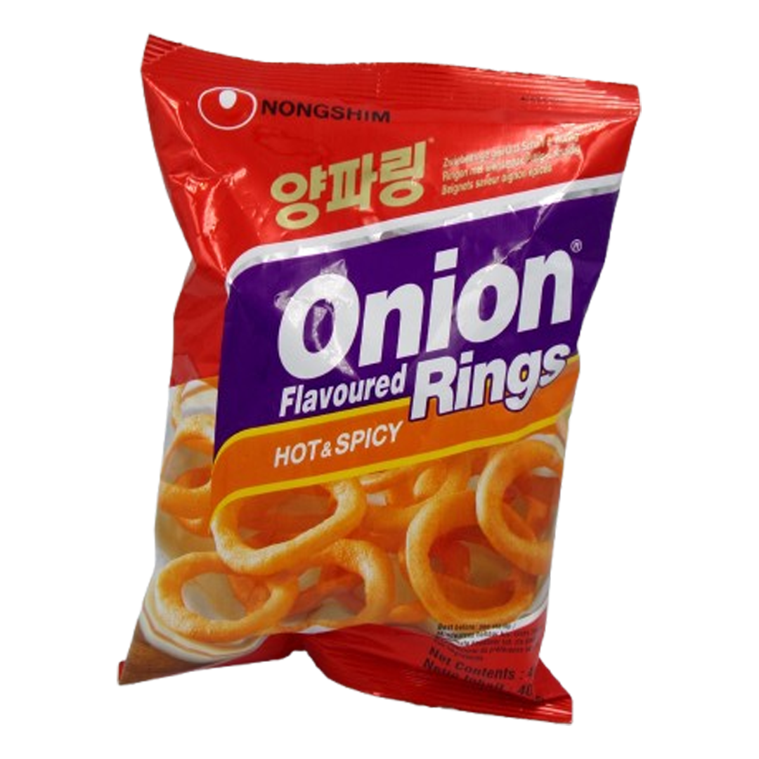 Nongshim Onion Rings Spicy is a 40g pack of ring-shaped Korean snack chips made from a wheat, corn, and potato-based dough, seasoned with onion powder, hot chili powder, and other ingredients to provide a savory, aromatic, and spicy taste and crispy texture. These ready-to-eat rings are a popular snack option, perfect for on-the-go consumption, and can also be used as a crunchy topping for other dishes.