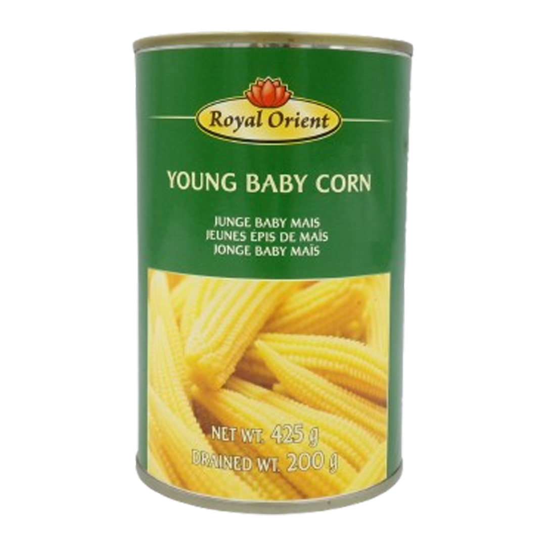 ROYAL ORIENT YOUNG BABY CORN 425GR is a can of baby corn, a tender, sweet, and crispy vegetable picked young from regular corn plants before fertilization, ideal for Asian dishes like stir-fries and curries. It is canned in water with salt and citric acid (E330) for preservation and is a source of nutrients like Vitamins A and C. The product requires rinsing and draining before use, and opened cans should be refrigerated and consumed within two days.Nutritional values 100 g