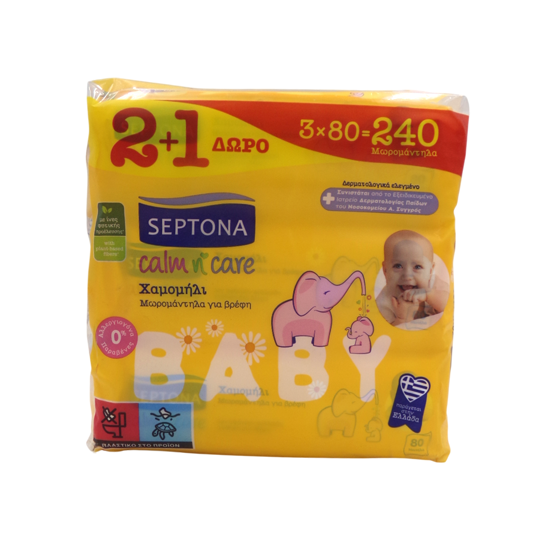 Septona calm n’ care Chamomile baby wipes are suitable for the daily care of the delicate infant skin. Their pure formula with chamomile extract and vitamin E cleanses your baby’s skin while providing natural care and a feeling of freshness. Dermatologically tested. 0% Ethanol