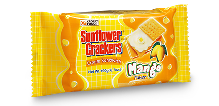CROLEY Sunflower Crackers Mango 190 g are crispy cream-sandwich crackers filled with a sweet, mango-flavored cream between crunchy cracker layers.