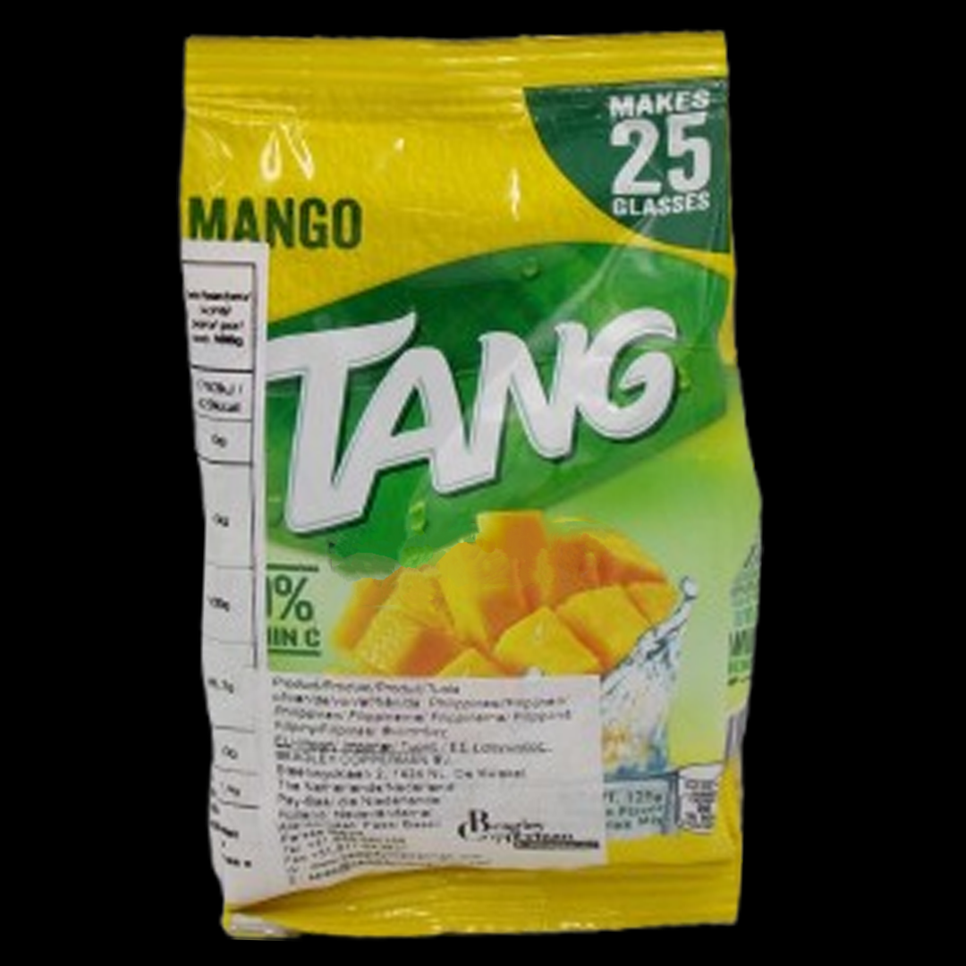 The ingredients for Tang Mango Drink Powder 125g include sugar, acidity regulators (like citric acid), stabilizers (such as xanthan gum), anti-caking agents (like tricalcium phosphate), sweeteners, mango flavor, vitamins (including vitamin C), minerals (like iron), and food coloring agents.