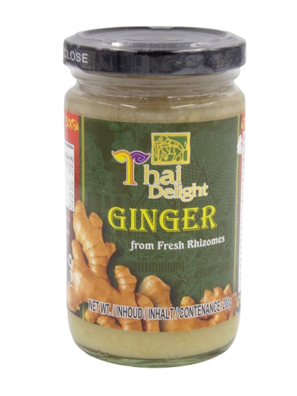 “Thai Delight Ginger is a minced ginger paste in a 200g package, made with 50% fresh ginger, water, citric acid (E330), salt, and sodium metabisulfite (E223) as a preservative, making it suitable for various Thai and Asian dishes to add a warm, spicy flavor.