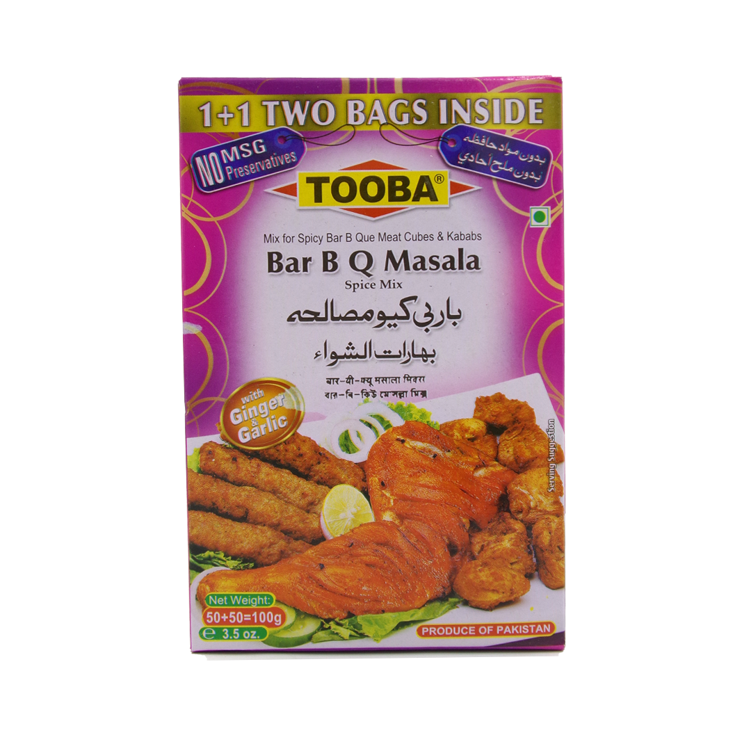TOOBA Bar B Q Masala is a ready-to-use spice mix crafted to enhance grilled, roasted, and barbecued dishes with smoky, spicy, and savory flavour. This convenient 100 g packet is ideal for marinating meats, poultry, fish and vegetables before grilling, roasting, or pan-frying.
