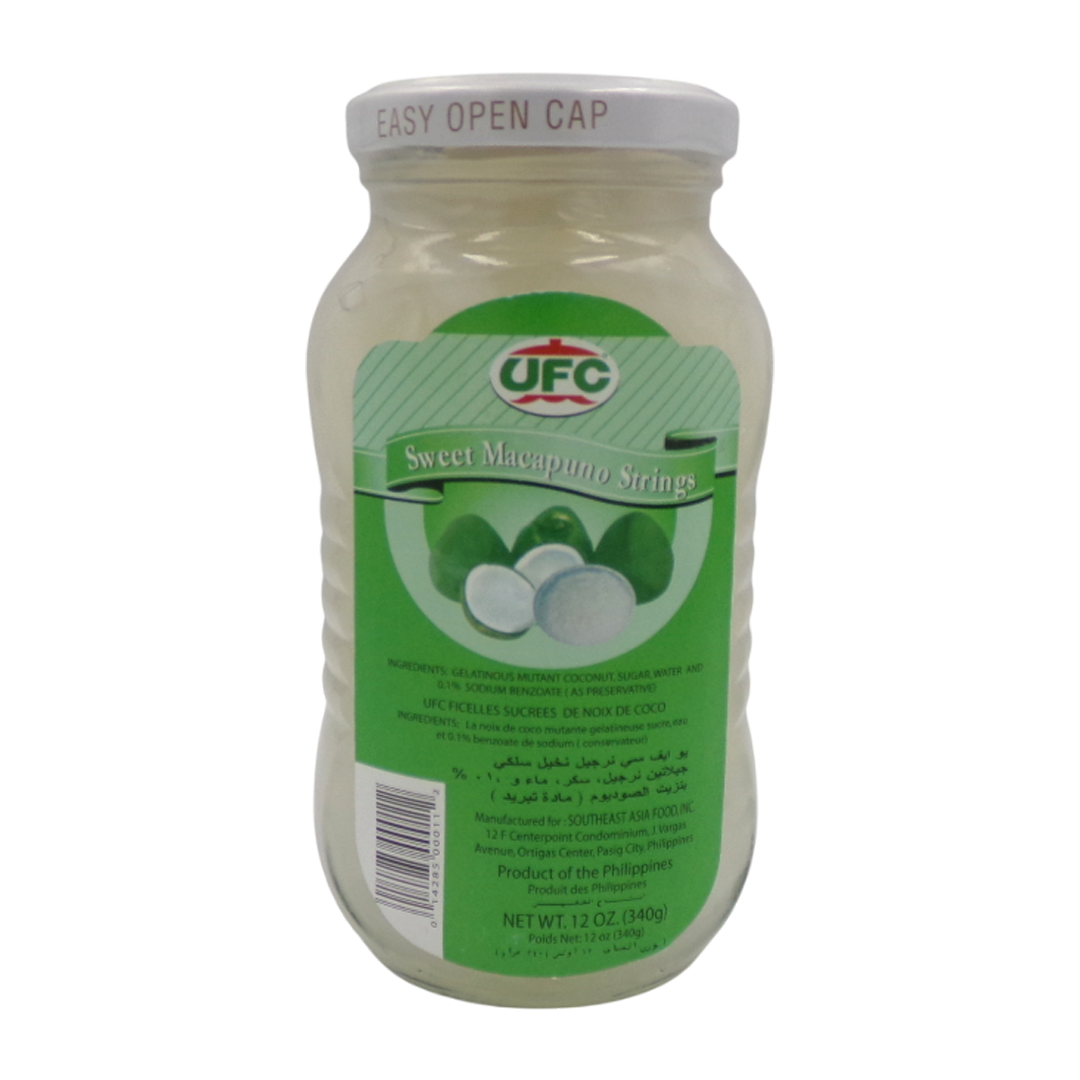 “UFC Sweet Macapuno Strings are a jarred product of shredded, sweetened, jelly-like coconut “”sport”” from the Philippines, known for its chewy texture and mild, sweet flavor. Sourced from a coconut variety with an unusually developed endosperm, Ingredients: