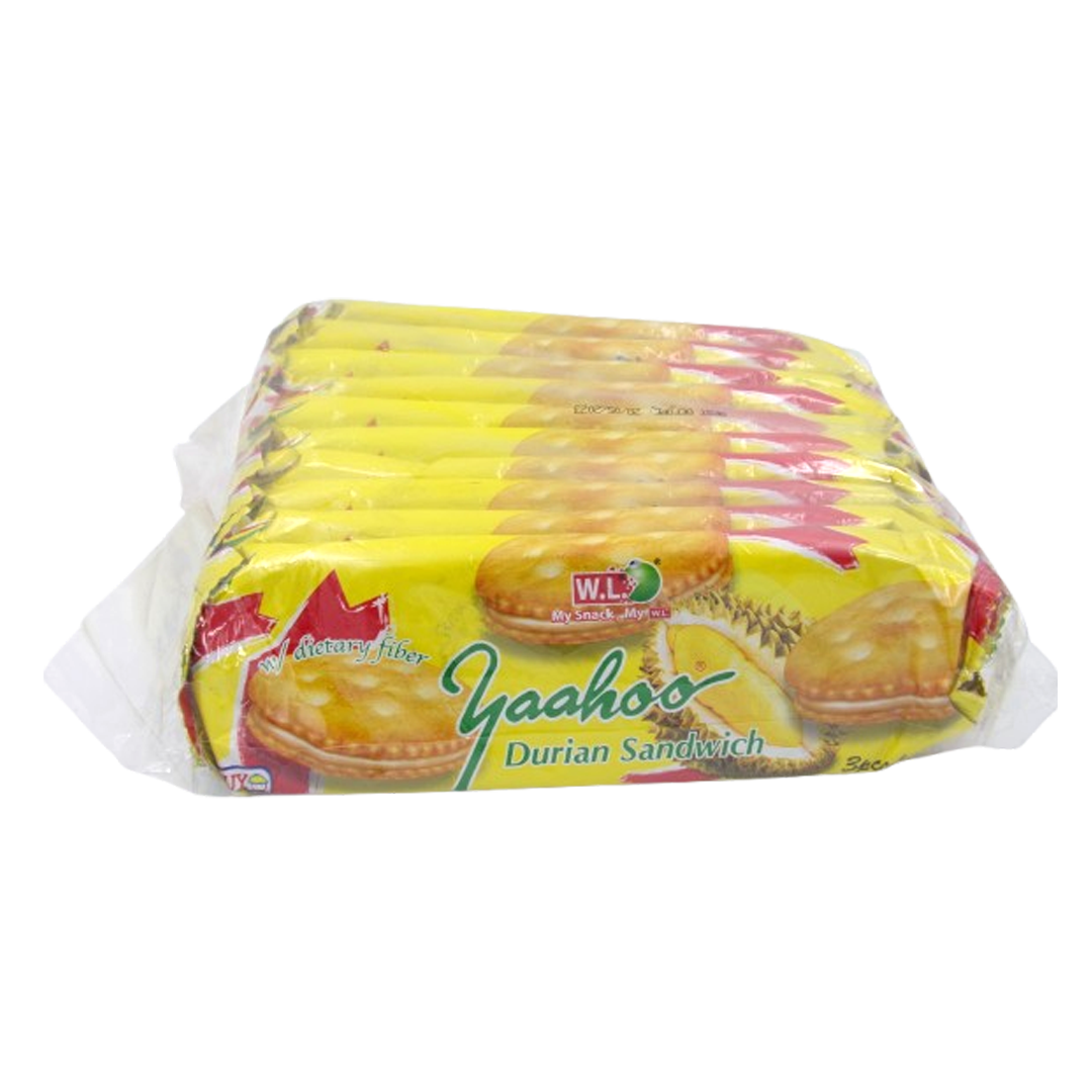 “he W.L. Yaahoo Durian Sandwich is a biscuit product from the Philippines by WL Foods, containing a durian-flavored filling between two savory biscuits. Each pack contains 10 individual 25g sandwich biscuits, making a total of 250g of product. The ingredients include wheat, vegetable oils, sugar, powdered milk, durian spice, salt, yeast, and a coloring agent (E102), which may have an adverse effect on children’s activity and attention.