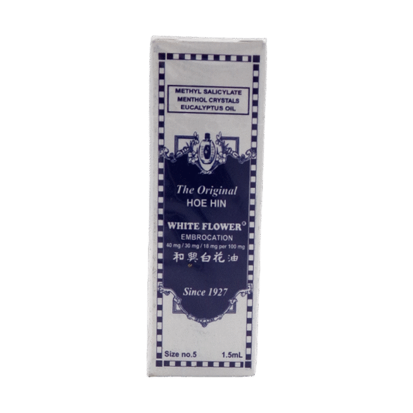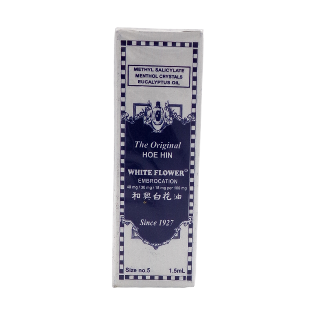White Flower Embrocation 1.5mL by Hoe Hin is a medicated oil that provides relief for headache, dizziness, motion sickness, muscle pain, insect bites, and symptoms of the common cold, including stuffy nose. Ingredients: Methyl Salicylate, Menthol Crystals, and Eucalyptus Oil,