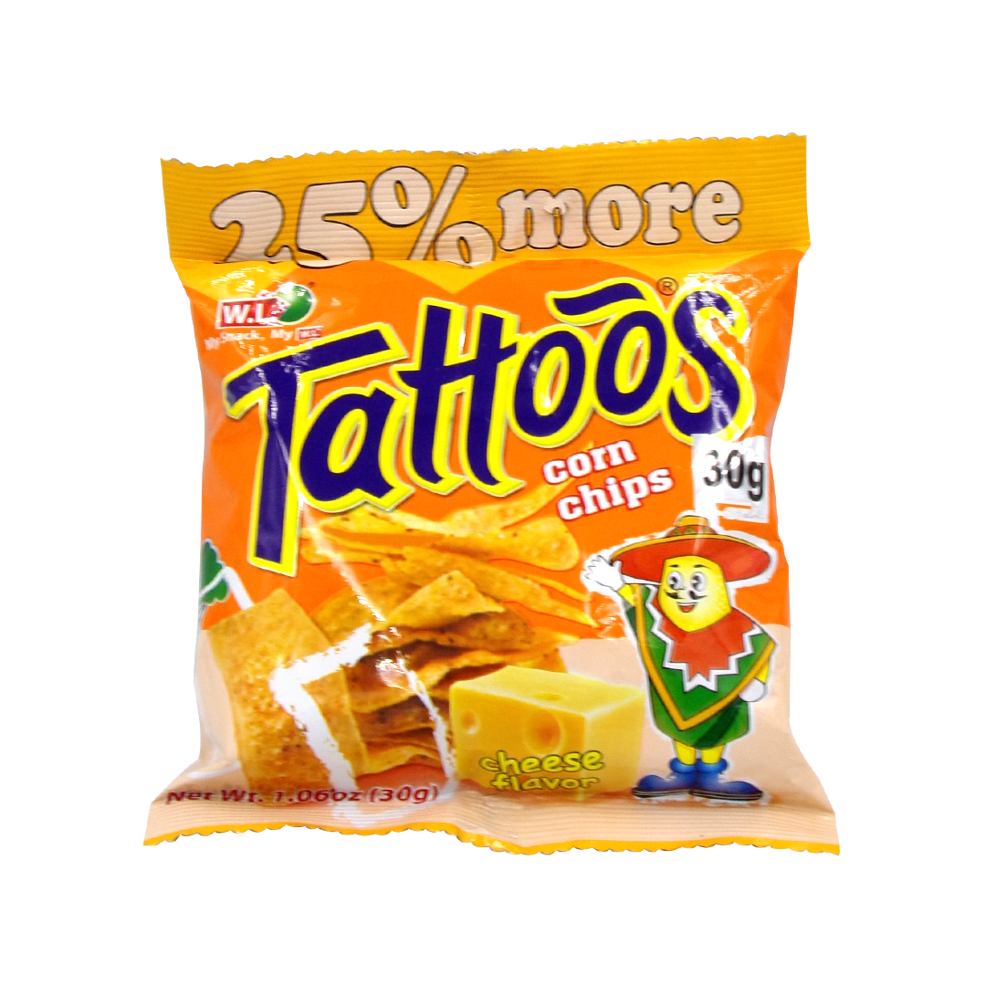 Indulge in a burst of flavor with W.L. Foods – Cheese Flavor Tattoos Corn Chips! These crispy chips are perfect for satisfying your cravings with every bite. Enjoy the tangy cheese taste and unique tattoo shapes. Each bag contains 30G of cheesy goodness. Treat yourself to a delicious snack now!