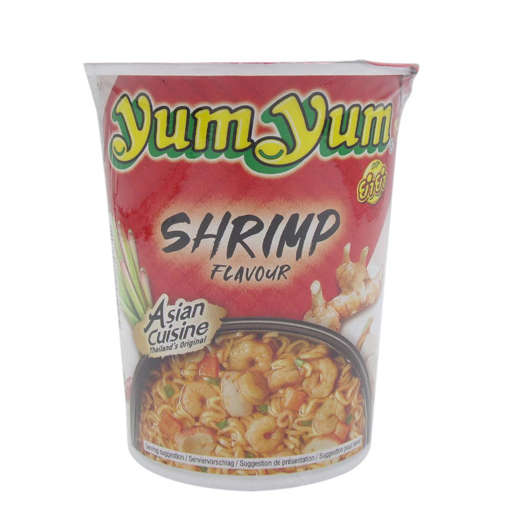 Yum Yum Cup Noodle Shrimp Flavor offers an authentic Thai Tom Yum experience with a signature sour-spicy taste, elastic noodles, and a rich soup base enhanced with ingredients like dried shrimp, lemongrass, chili, and galangal.